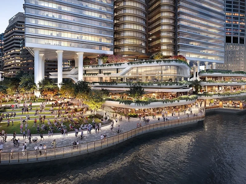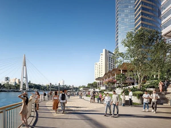 The wider riverfront plan includes new public space and future dining areas set back from the path, along with landscaping described as subtropical or tropical in style. Plans also flag cyclist end-of-trip facilities, including bike storage and e-bike servicing. Developers say the rebuilt public realm is being shaped to keep the walkway usable while the larger site takes shape.