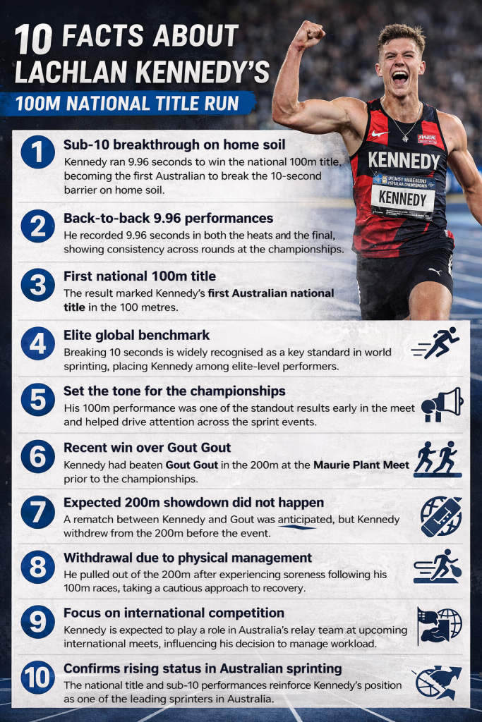 The 9.96-second run carries significance beyond the title itself. It marked the first time an Australian has broken the 10-second barrier on home soil, placing Kennedy in a small group of athletes who have achieved sub-10 times internationally.